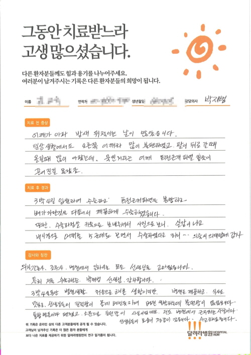 달려라 병원에서 치료를 받으신 환자 분들께서 직접 전달해주신 감사의 글입니다.