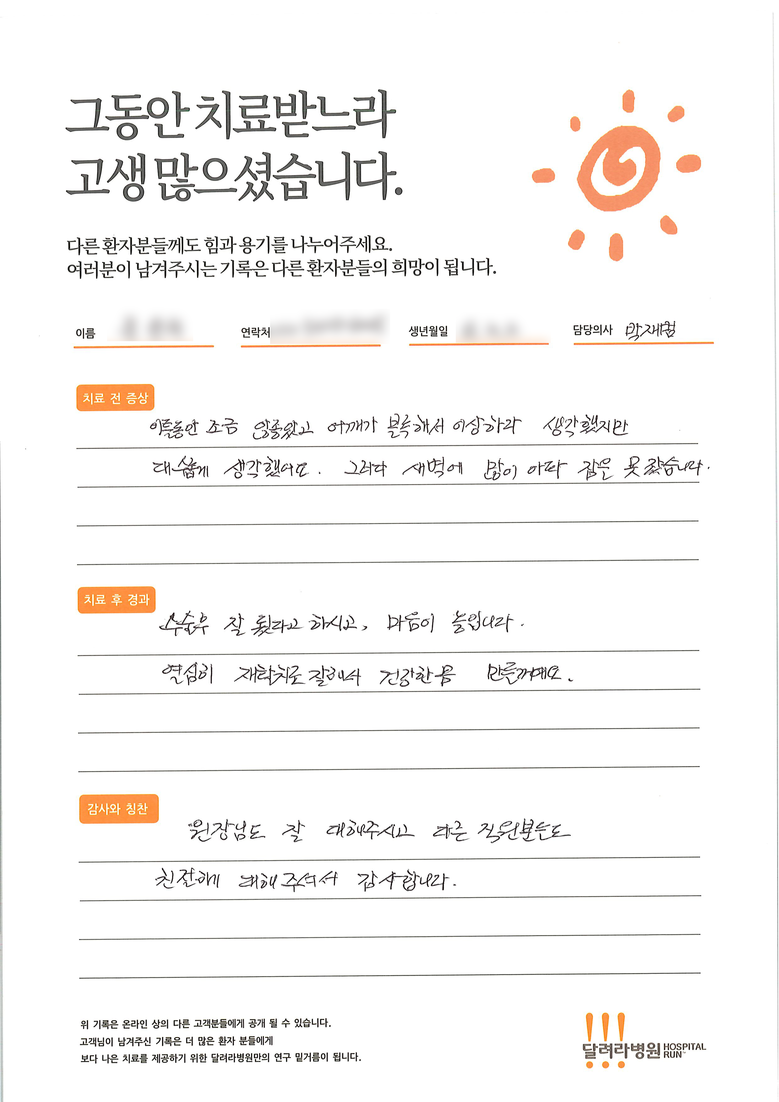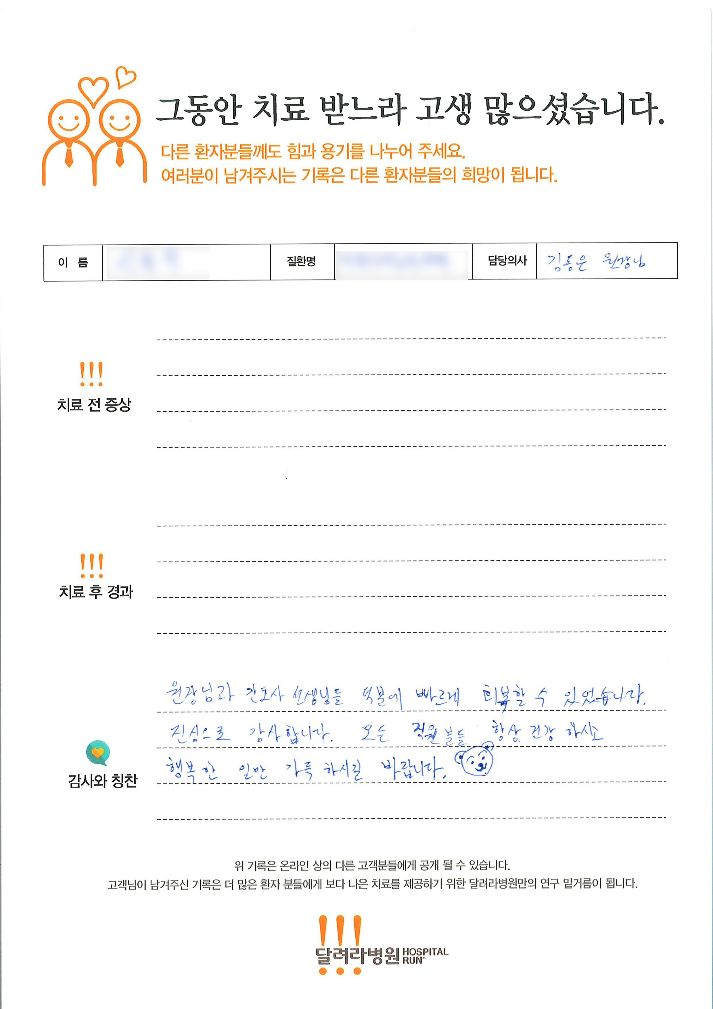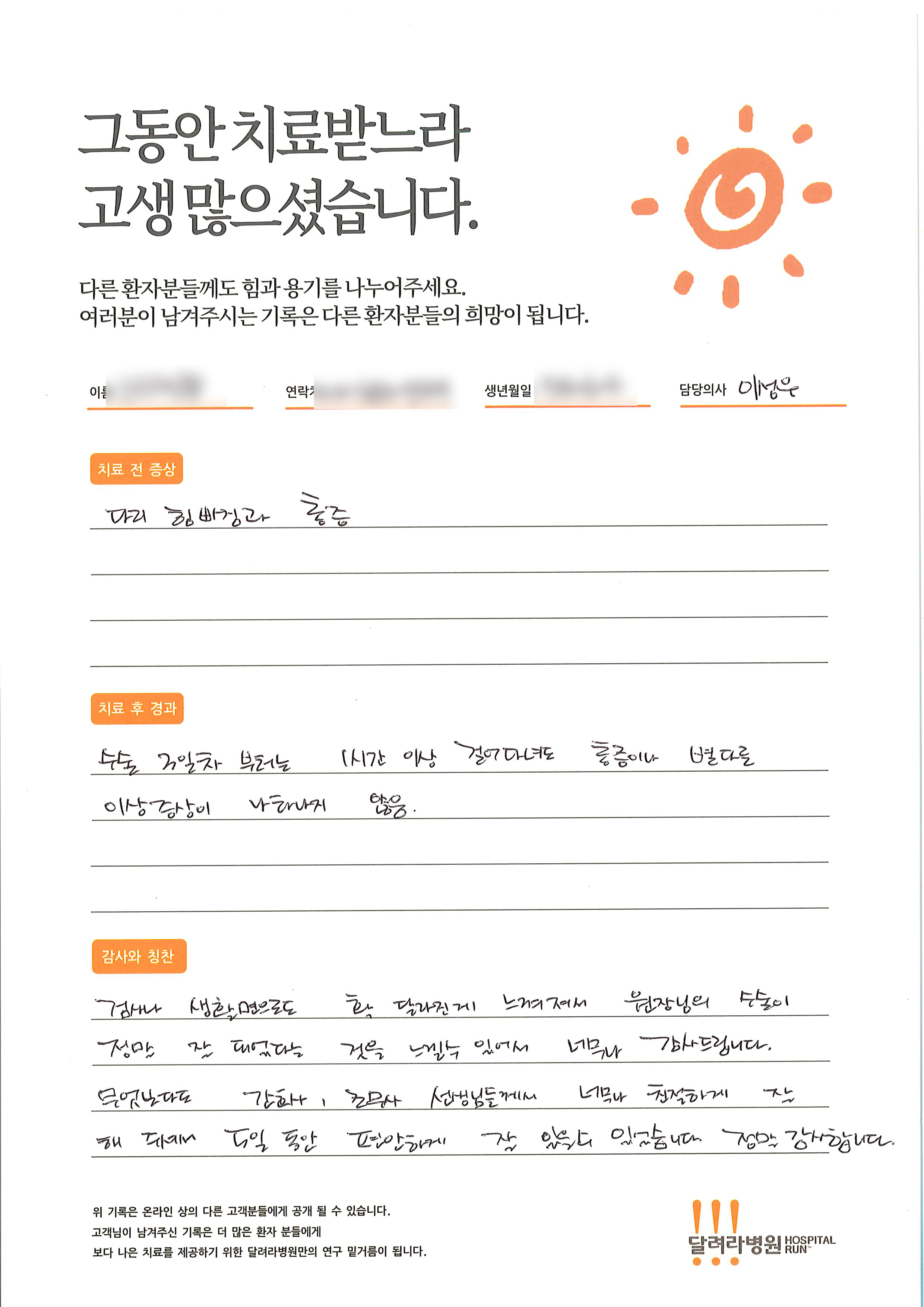 달려라 병원에서 치료를 받으신 환자 분들께서 직접 전달해주신 감사의 글입니다.