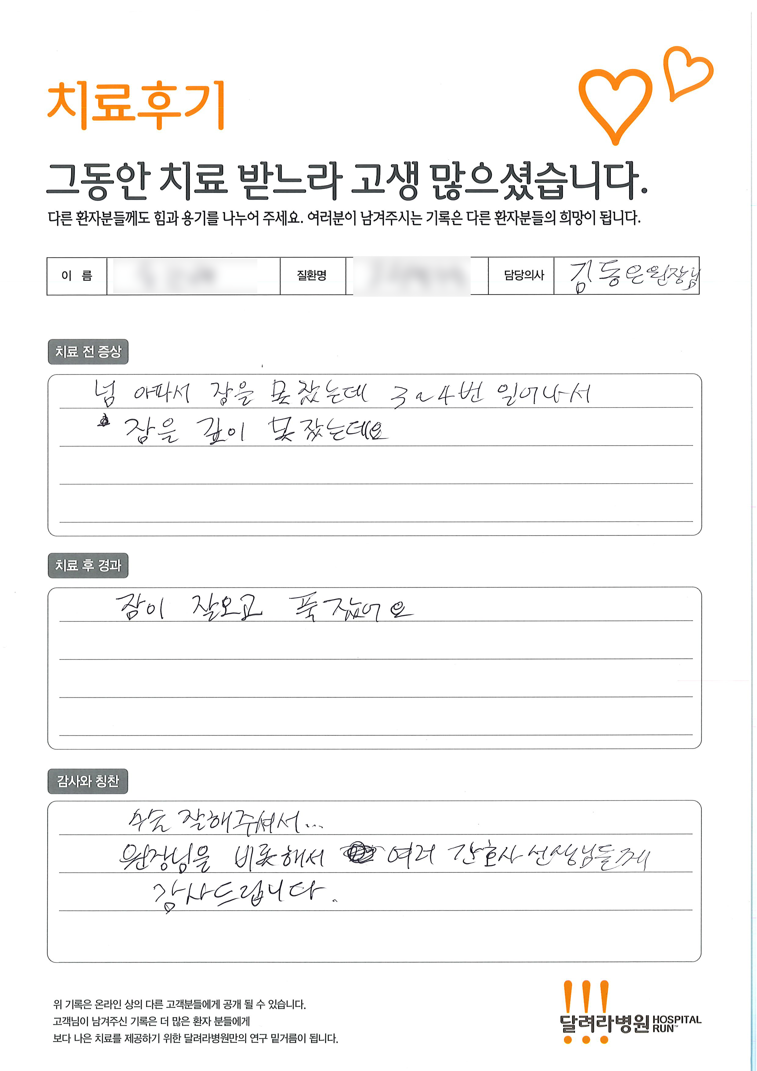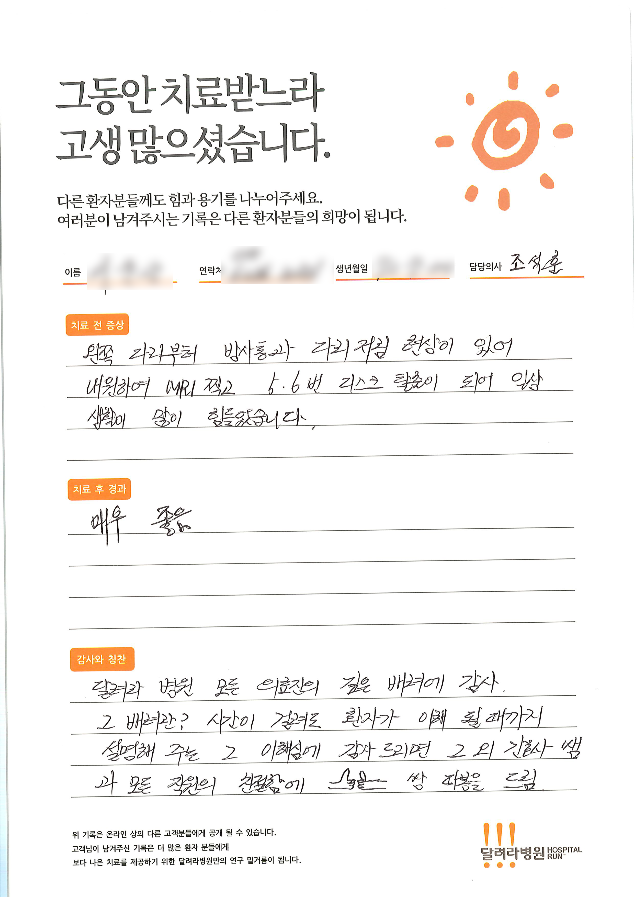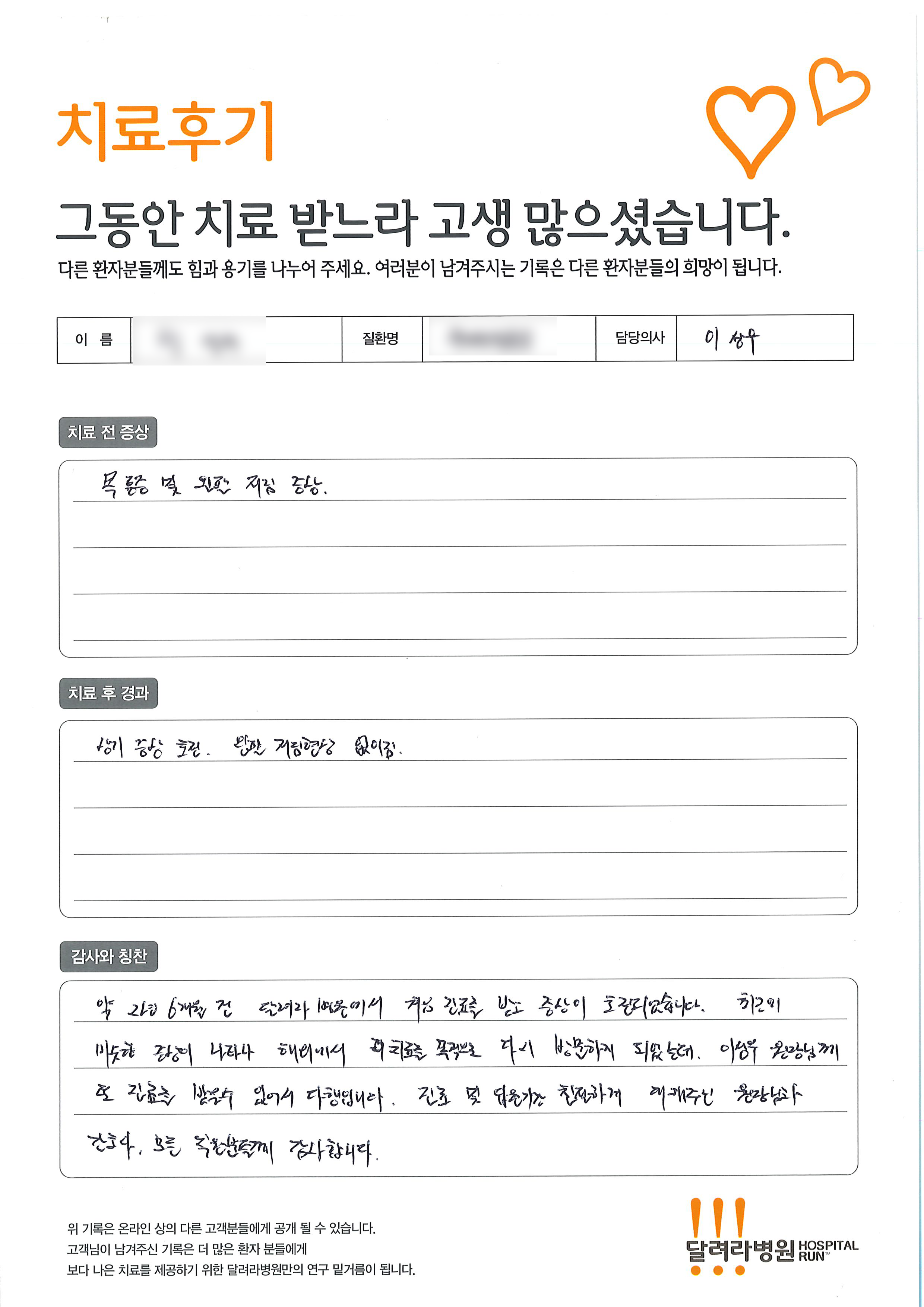 달려라 병원에서 치료를 받으신 환자 분들께서 직접 전달해주신 감사의 글입니다.