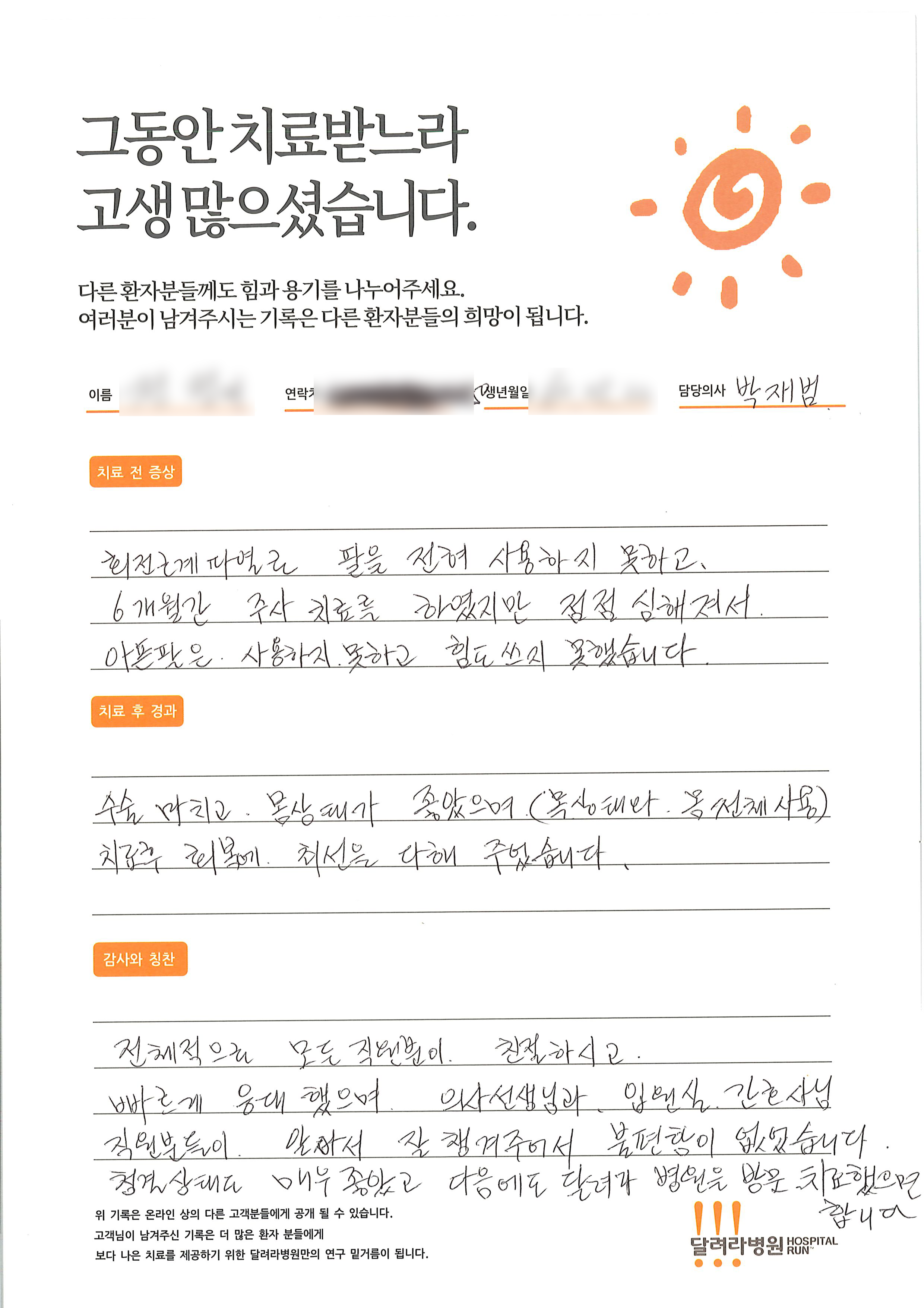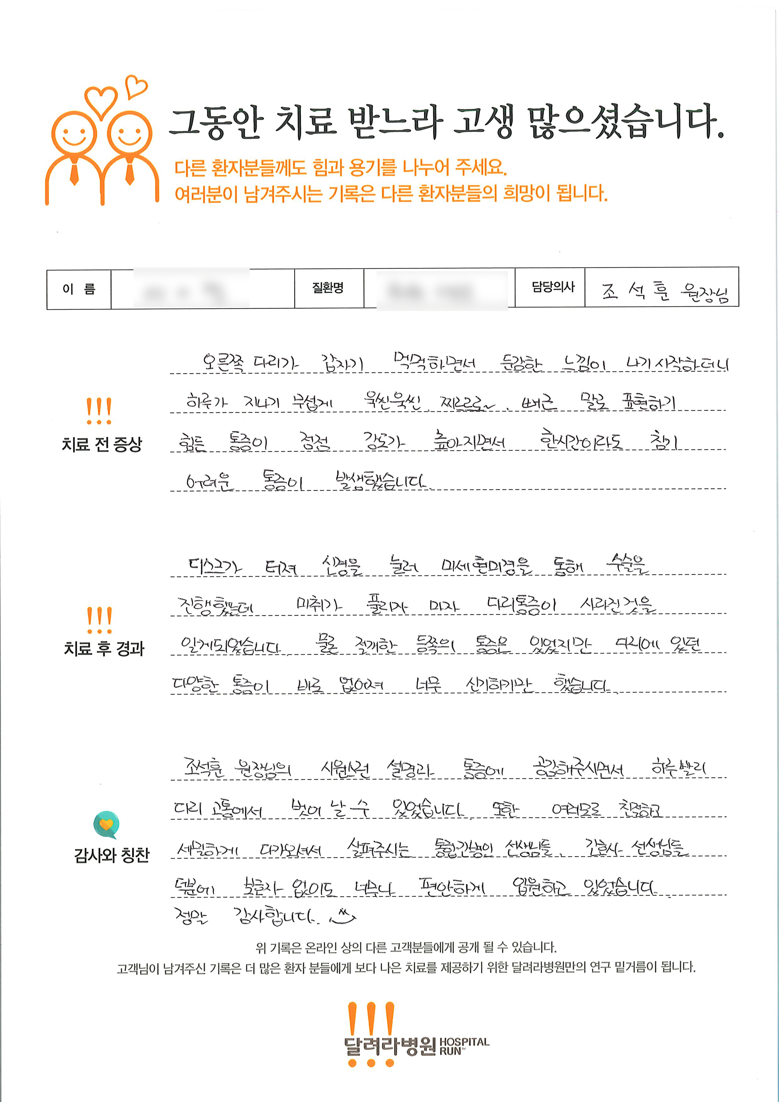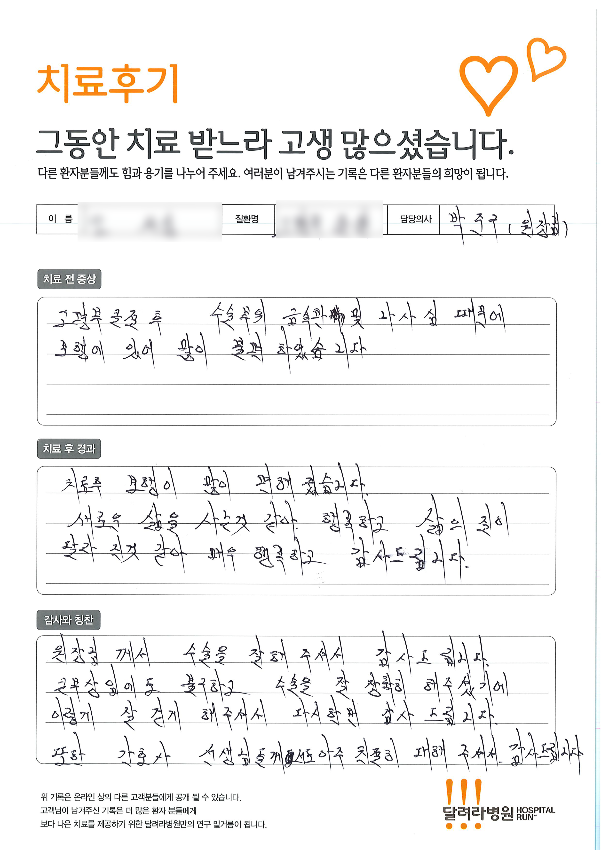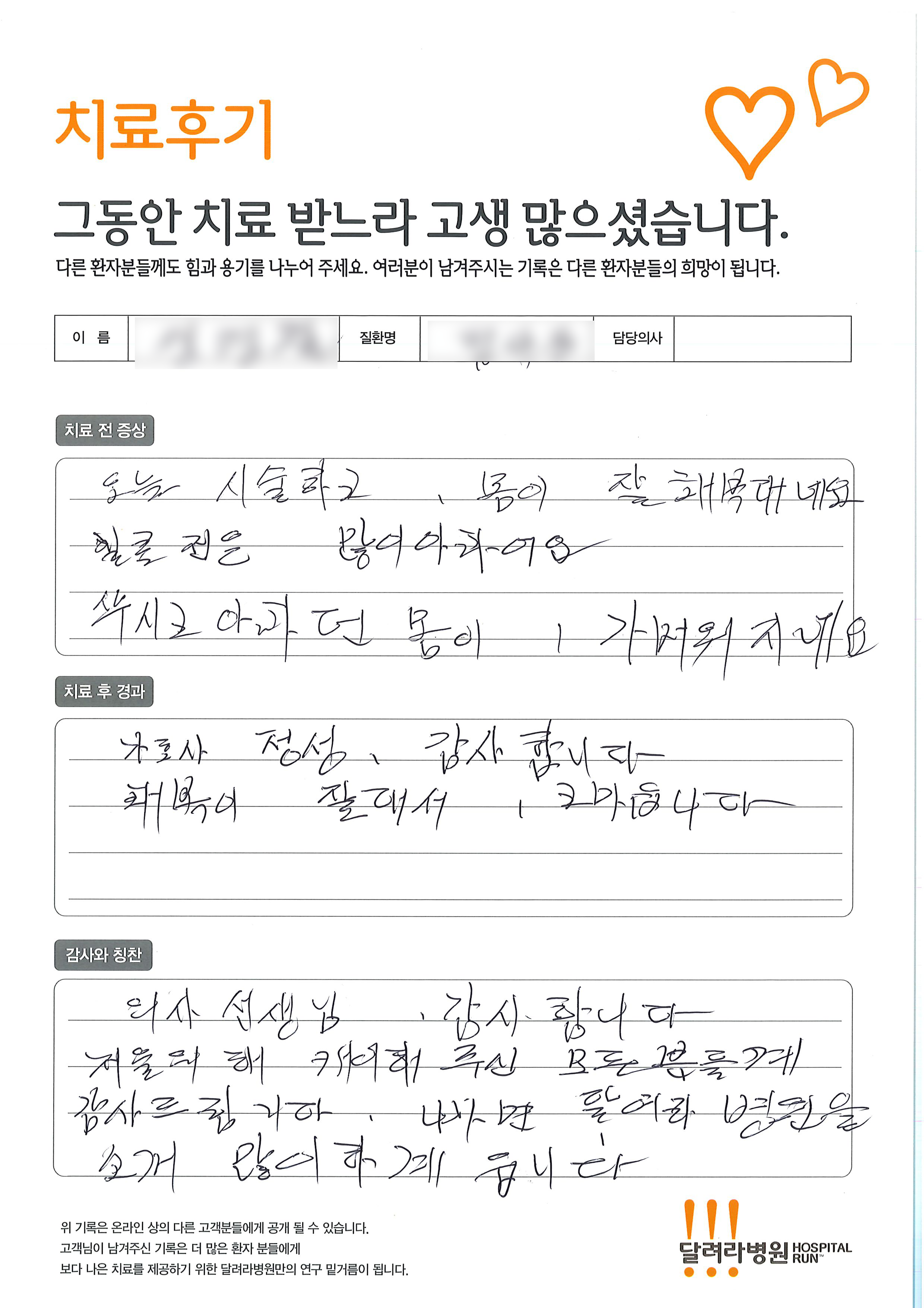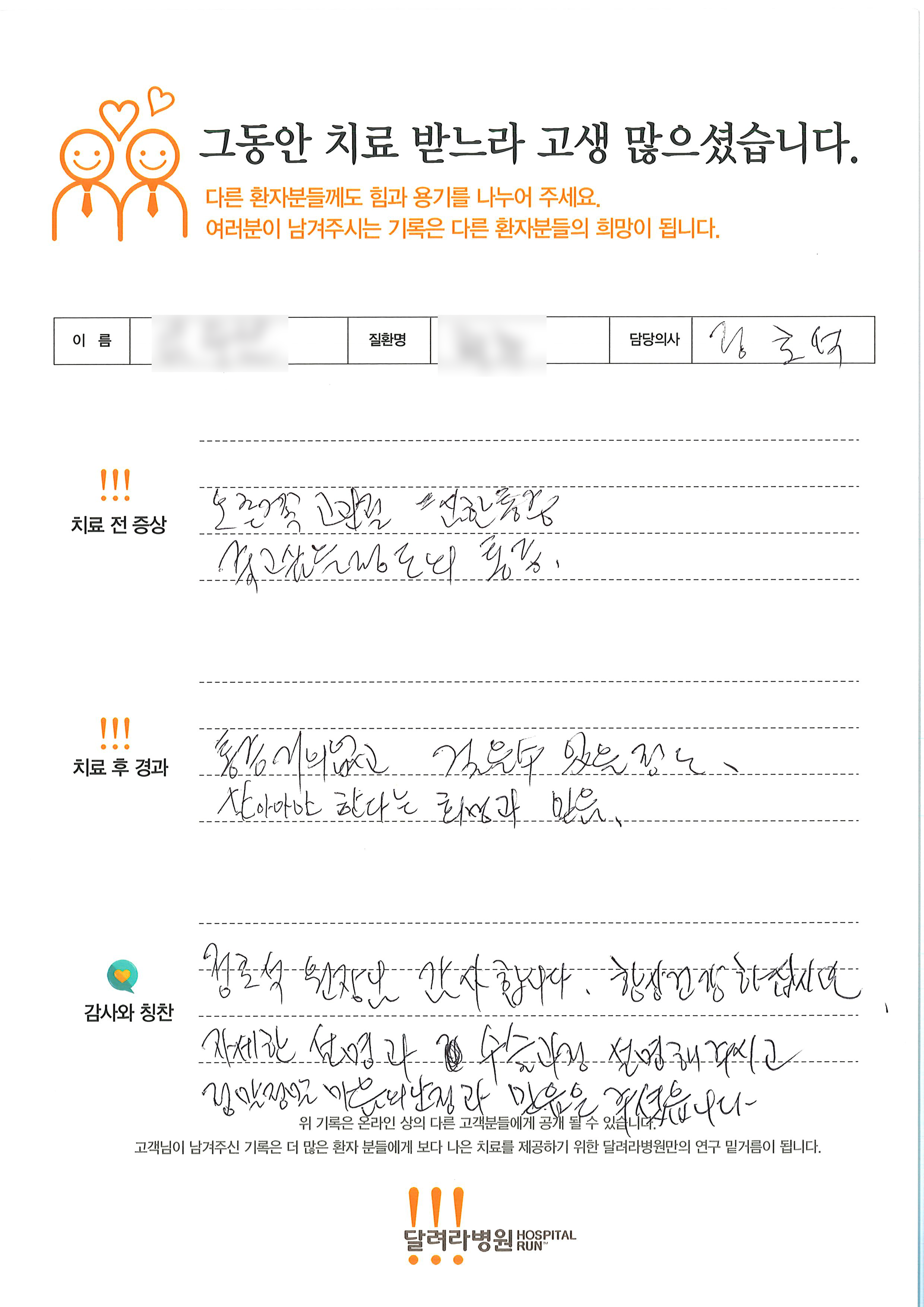 달려라 병원에서 치료를 받으신 환자 분들께서 직접 전달해주신 감사의 글입니다.