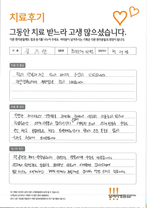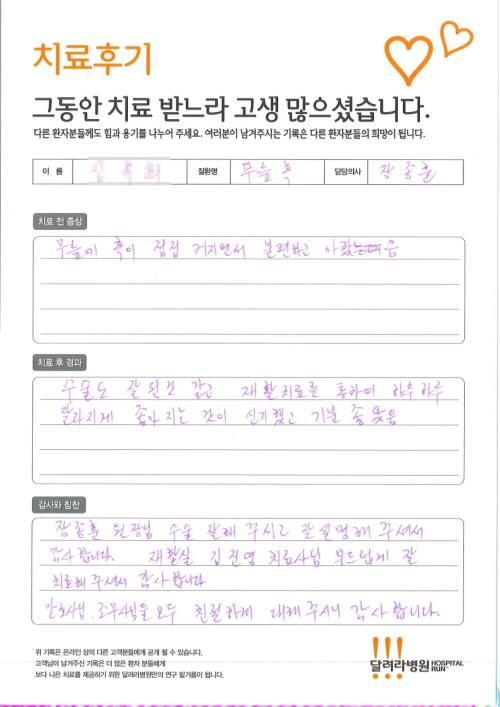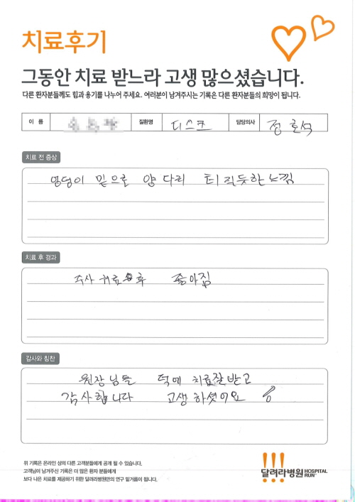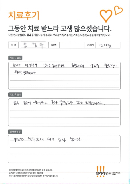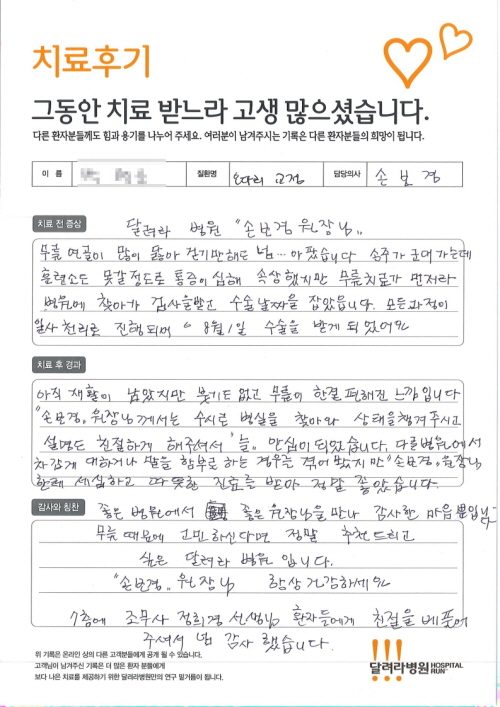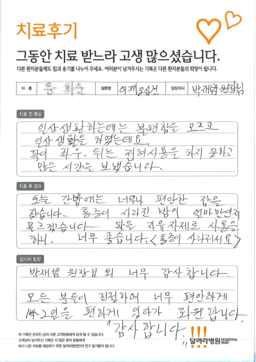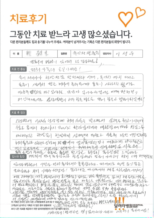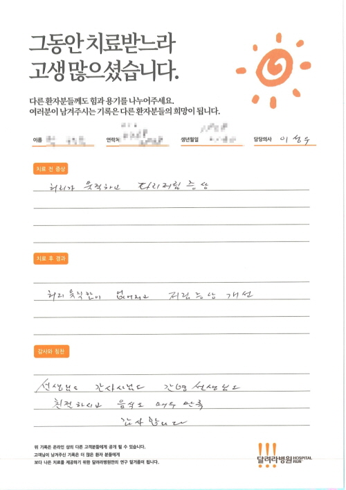 달려라 병원에서 치료를 받으신 환자 분들께서 직접 전달해주신 감사의 글입니다.