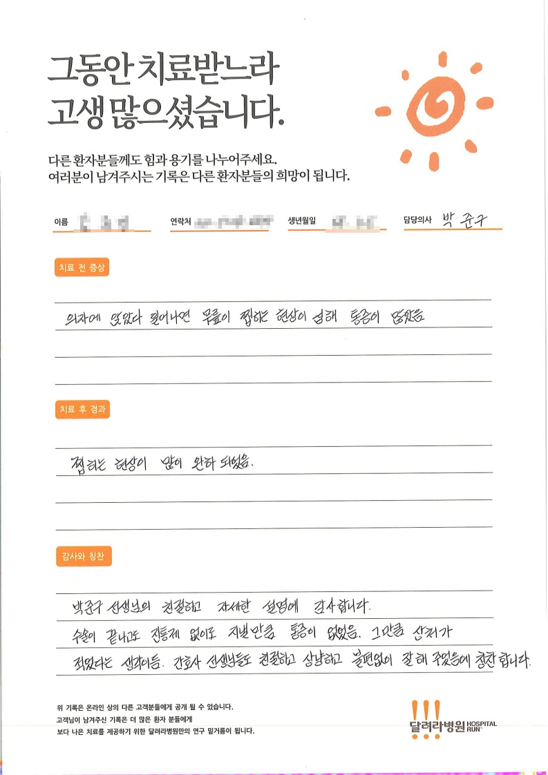 달려라 병원에서 치료를 받으신 환자 분들께서 직접 전달해주신 감사의 글입니다.