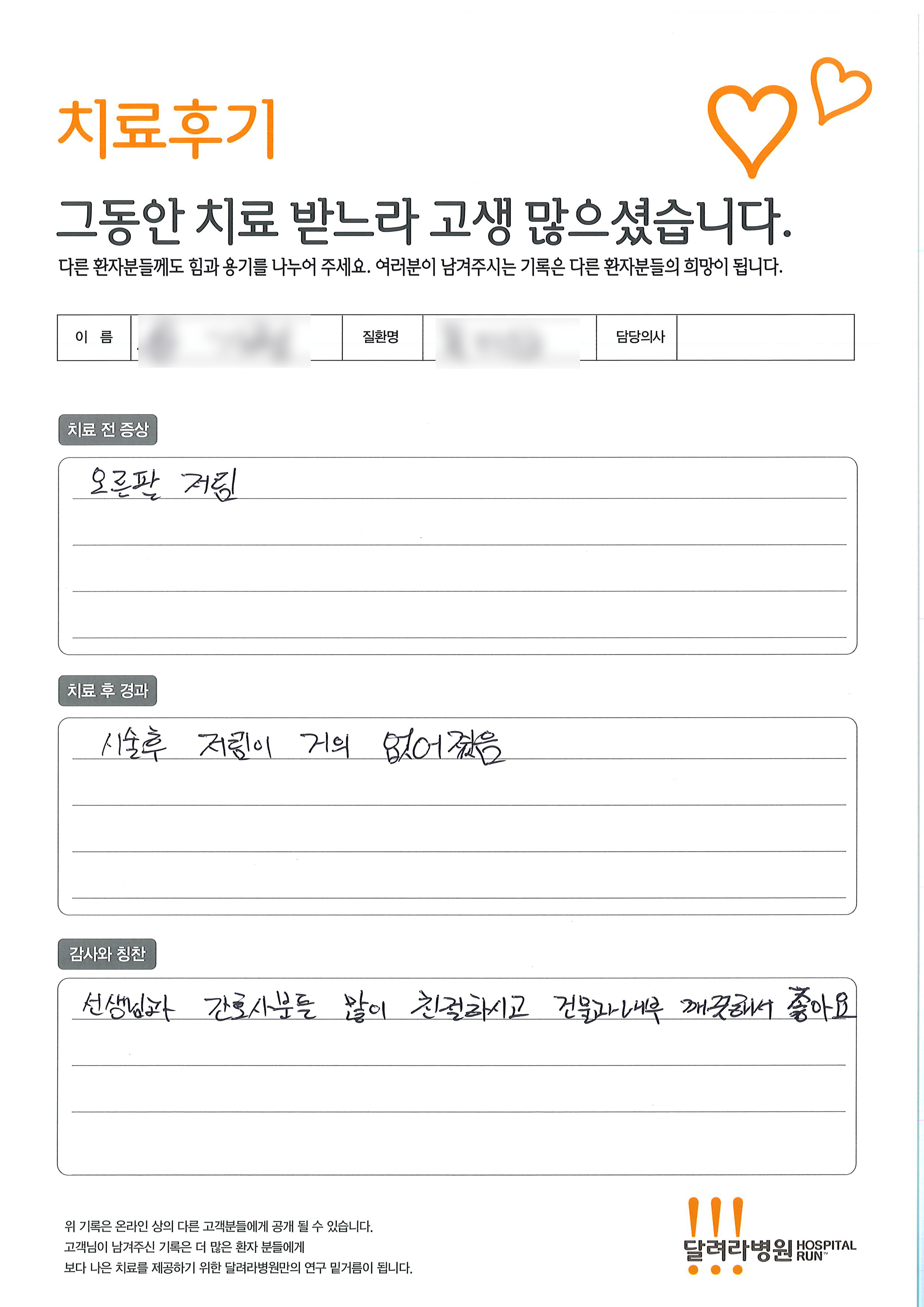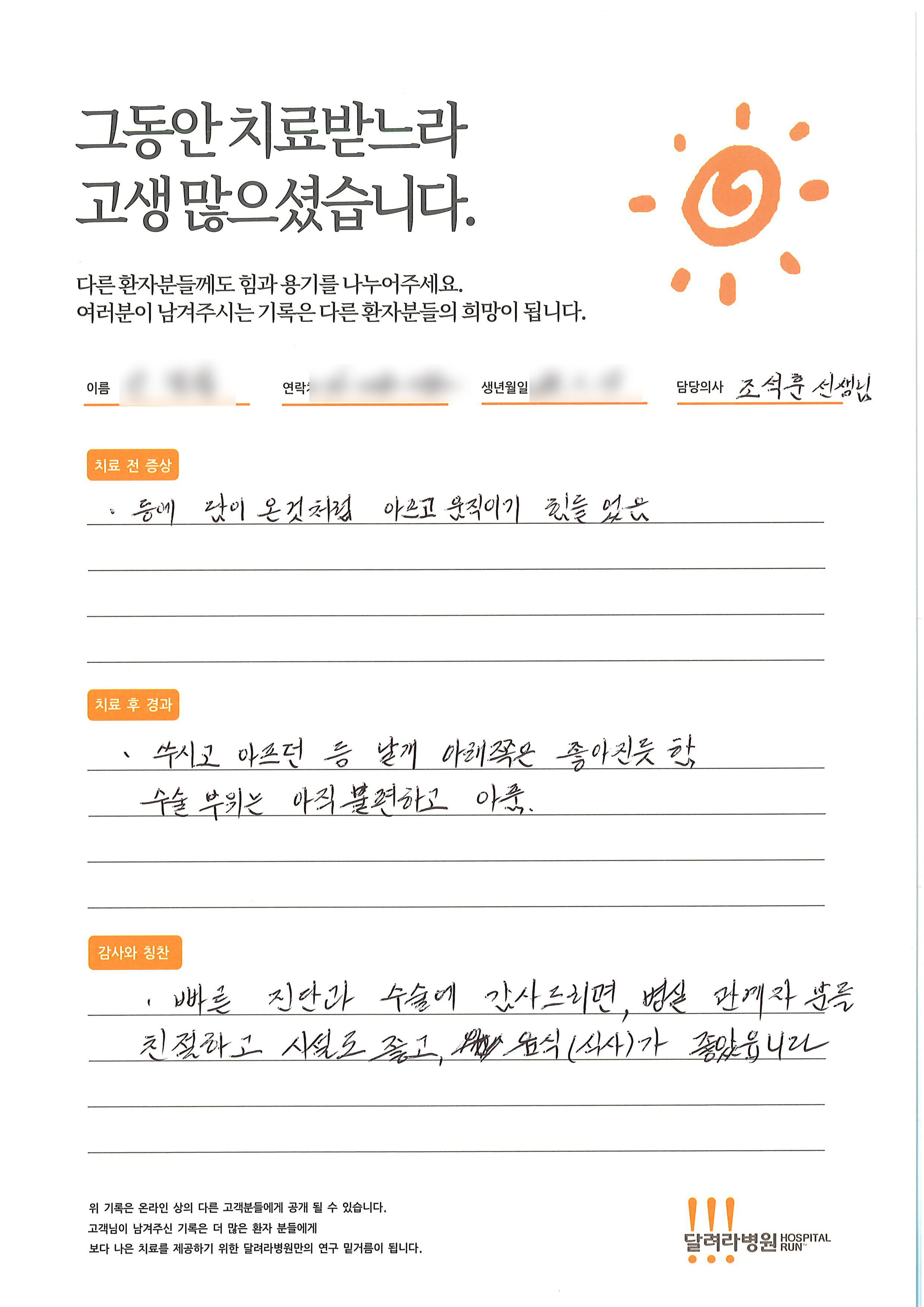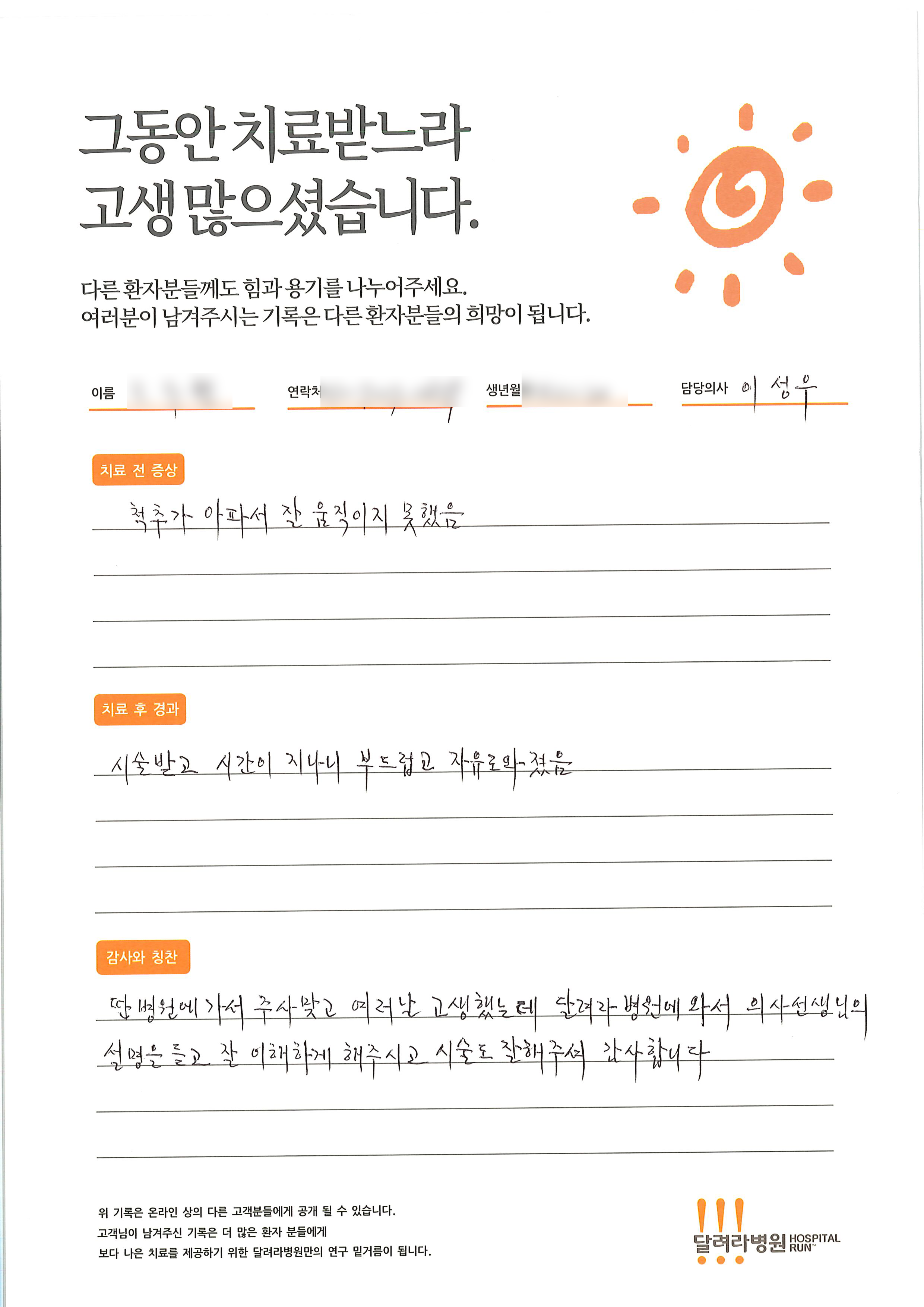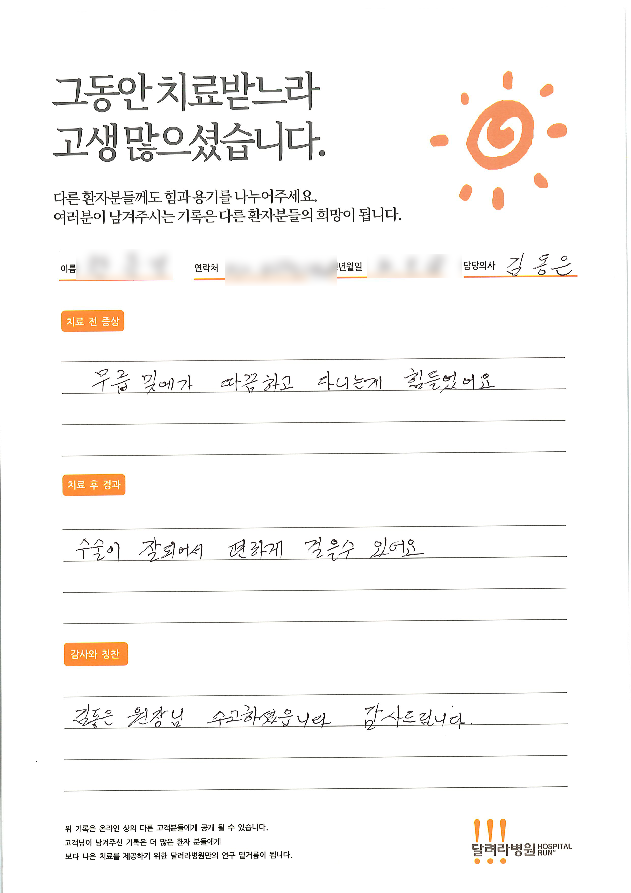 달려라 병원에서 치료를 받으신 환자 분들께서 직접 전달해주신 감사의 글입니다.