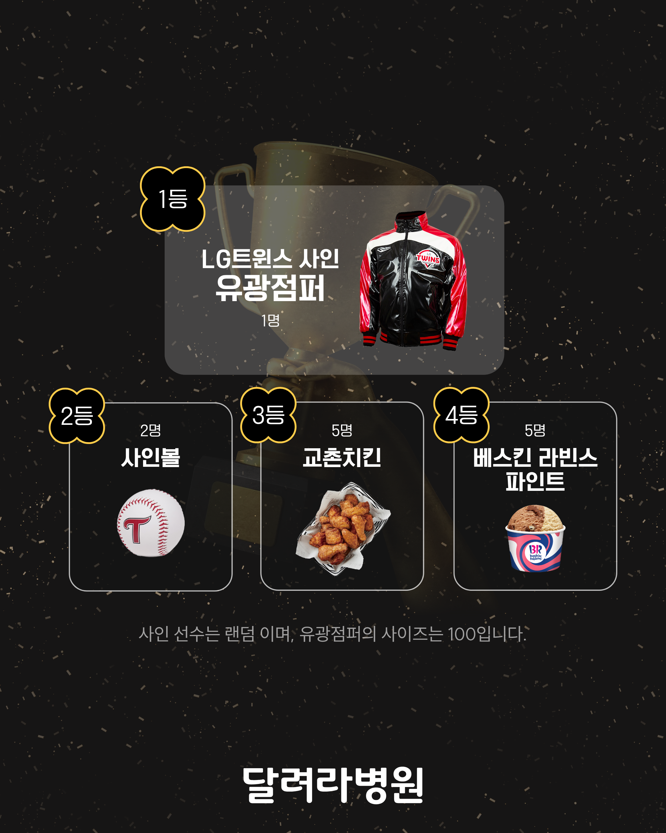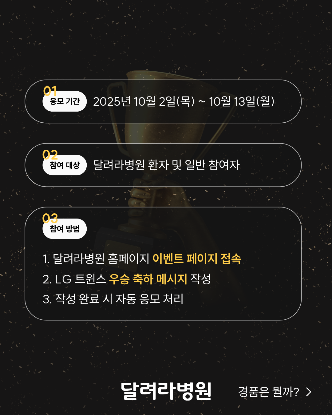한화팬이지만 달려라병원의 환자로서 협력병원의 구단인 엘지 트윈스의 우승을 축하드립니다! 달려라병원도 한국 병원 1등이 되길 바랍니다!