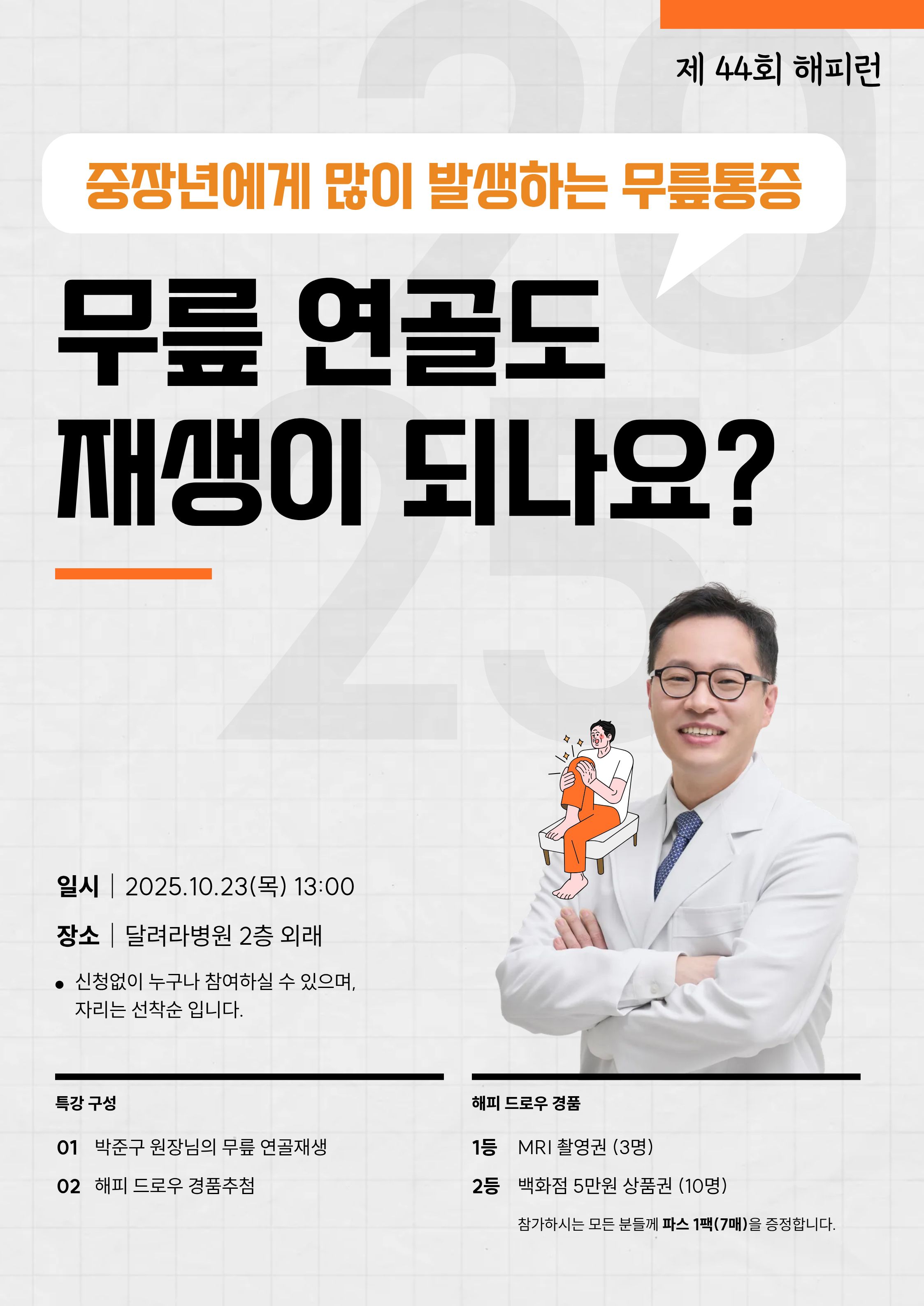 ![]() 안녕하세요. 달려라병원입니다. 2025년 10월, 해피런이 진행됩니다. 박준구 원장님의 '무릎 연골도 재생이 되나요?'에 대한 강연을 준비했습니다. 일시: 2025년 10월 23일(목) 오후 1시 장소: 달려라병원 2층 외래 * 신청없이 누구나 참여하실 수 있으며, 자리는 선착순 입니다. 특강 구성 1. 박준구 원장님의 무릎 연골재생 2. 해피드로우 경품추첨 1등. MRI 촬영권 3명 2등. 백화점 상품권(5만원) 10명 * 참가자 전원에게 파스 1팩(7매)을 드립니다. 특별 강연과 다양한 경품들이 준비되어 있으니 많은 참여 부탁드리겠습니다. 감사합니다! |