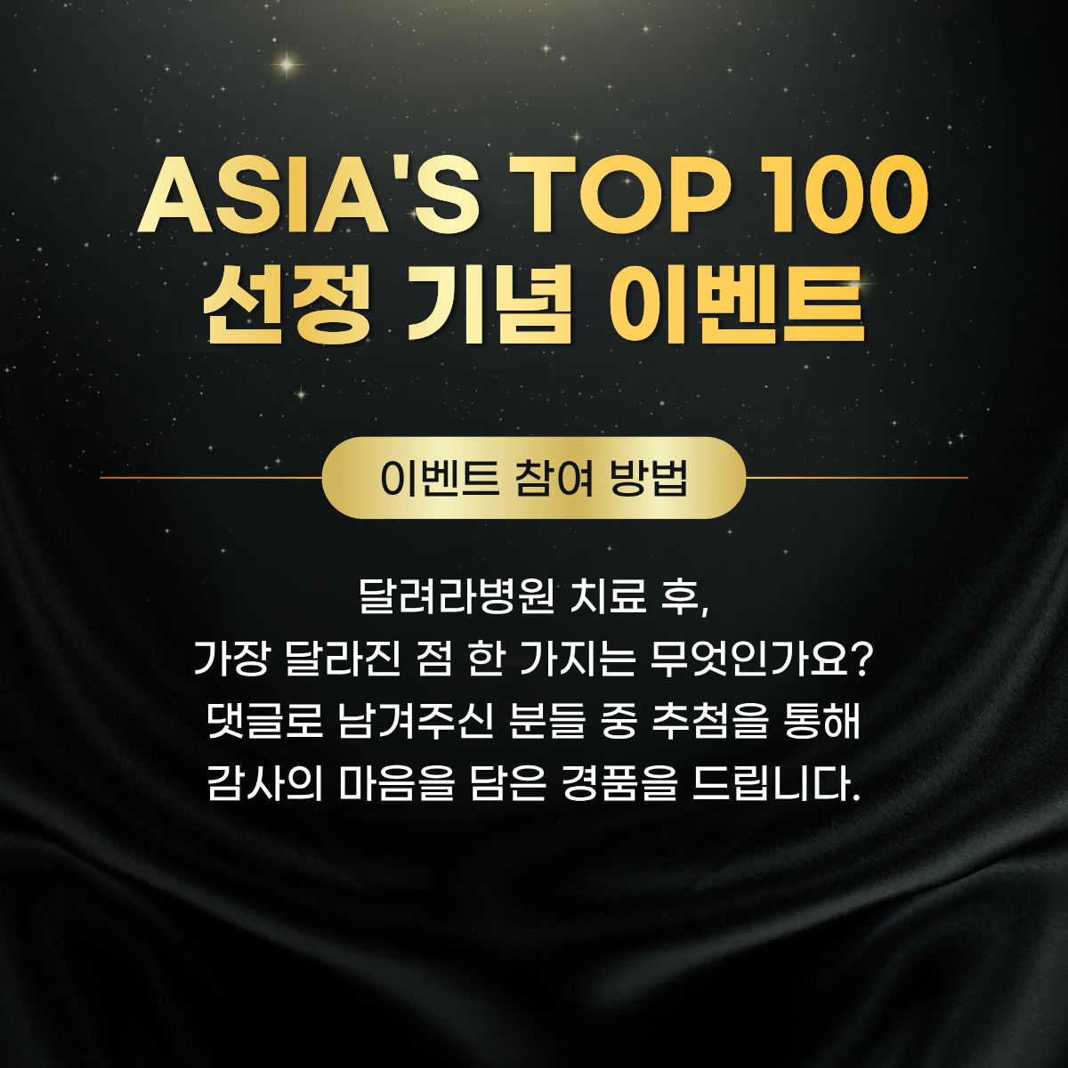 ![]() ![]() ![]() ![]() ![]() ▶ 이벤트 기간 2026년 2월 6일(금)~2월 18일(수) ▶ 참여혜택 추첨을 통해 - 파리바게뜨 2만원 교환권 10명 - 스타벅스 카페라떼 교환권 10명 ※ 당첨자 개별 안내 ▶ 아래 댓글에 치료 후 가장 달라진 점 한가지를 남겨주세요. 감사합니다! |
